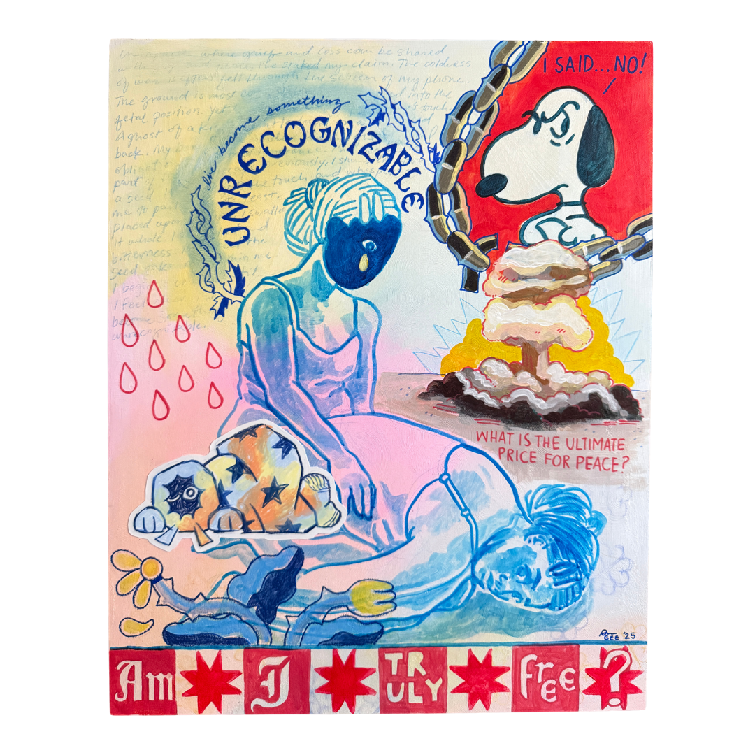 I was approached by Kat Tarbet @kat.culture to submit artwork to a show she was putting together that involved artists from all over Jacksonville. I submitted my piece “Unrecognizable” because it emphasized this idea of transformation and changing into something else. With all of the political turmoil and distress in the world, I created this piece as way of tryign to process this discomfort I was feeling. I was struggling with my sense of self and my faith was slipping away. Initally this painting started with a doodle of the hooded figure and then things started to take form. The discomfort I was feeling was starting to seep into my work life and I felt myself transforming into something unrecognizable. In the left corner I journaled about these thorny/prickly feelings and it became the title of the piece. More Info Here
